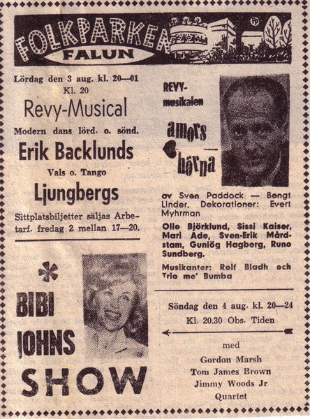 På Folkparks-turné med Olle Björklund 1963. Här besöker vi numera rivna Folkparken i Falun. Dagen efter var Bibi Johns Show där..... Erik Backlunds stod för den moderna dansmusiken och Ljungbergs bjöd på vals och tango!!! Det var tider det!