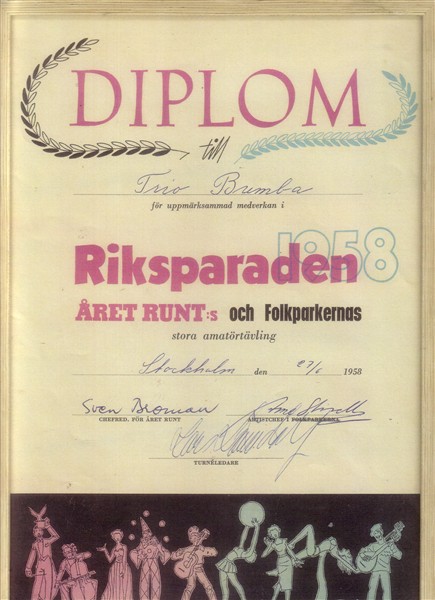 Här ett diplom från Riksparaden 1958, den stora Sverige-tävlingen där Lasse Lönndahl var programledare. Vi kom 2:a i Stockholm och vann gjorde sedemera sångerskan och skådespelerskan Anna Sundqvist. Anna gick tyvärr bort 1augusti i år, 2010, 67 år gammal.